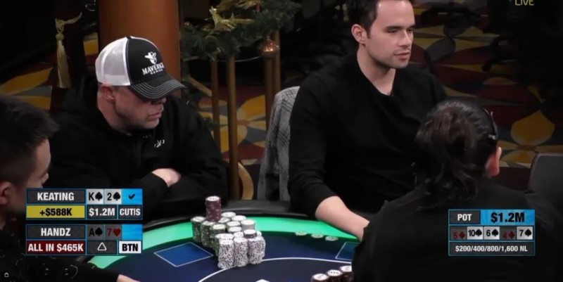 Handz的打法非常强势,唯一的问题是,Keating的手牌太强了,不能弃牌,在犹豫了一会儿后,他跟注赢得了Hustler Casino Live历史上最大的彩池,价值1,200,000!